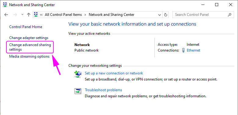Chọn Change Advanced Sharing Settings