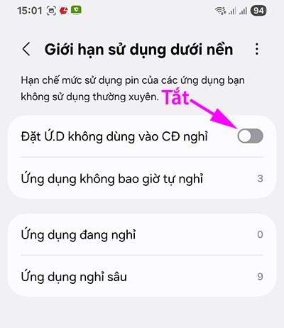 👉 Tắt chức năng Đặt ứng dụng không dùng vào chế độ nghỉ
