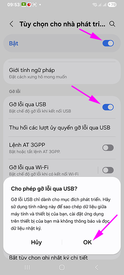 Vào menu Tùy chọn nhà phát triển bật Gỡ lỗi qua USB. Khi cắm cáp điện thoại vào máy tính thì ấn OK để cho phép gỡ lỗi qua USB