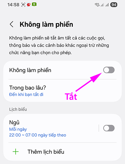 Vào menu Cài đặt ➡ Thông báo ➡ Không làm phiền