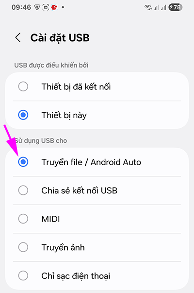 Kết nối điện thoại vào máy tính bằng cáp USB và chọn chế độ Truyền file